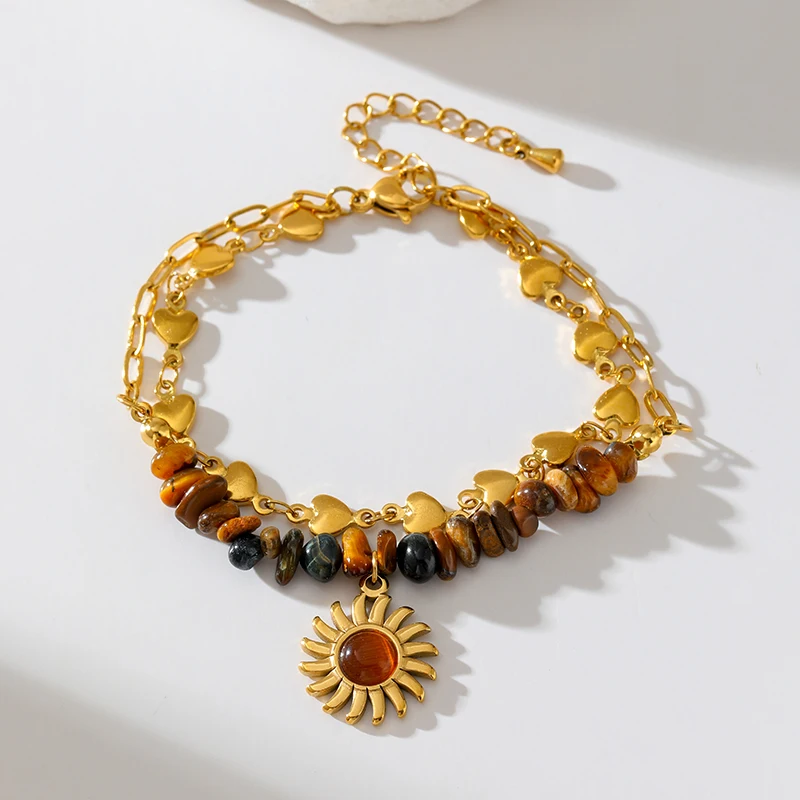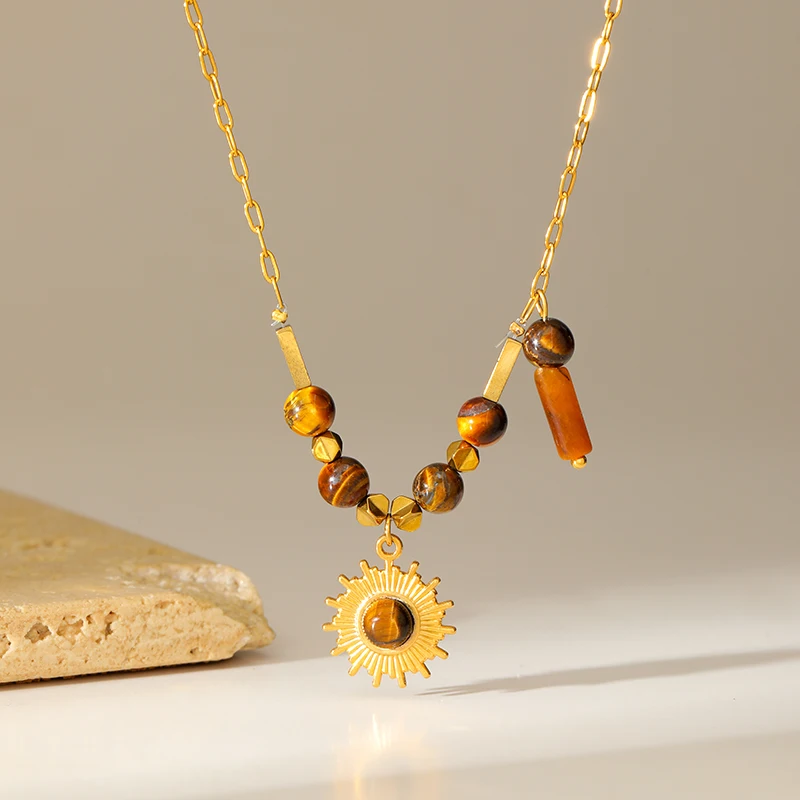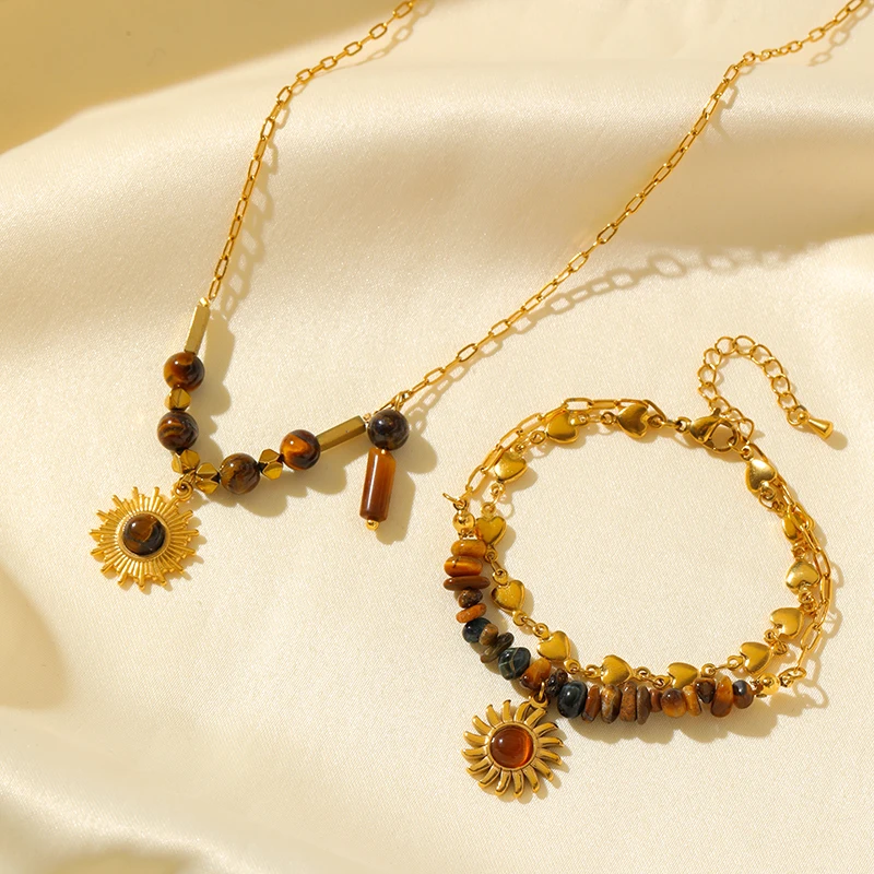 Ensemble collier et bracelet pendentif vintage en acier inoxydable 316L marron à perles, tendance pour femme, cadeau original et étanche.